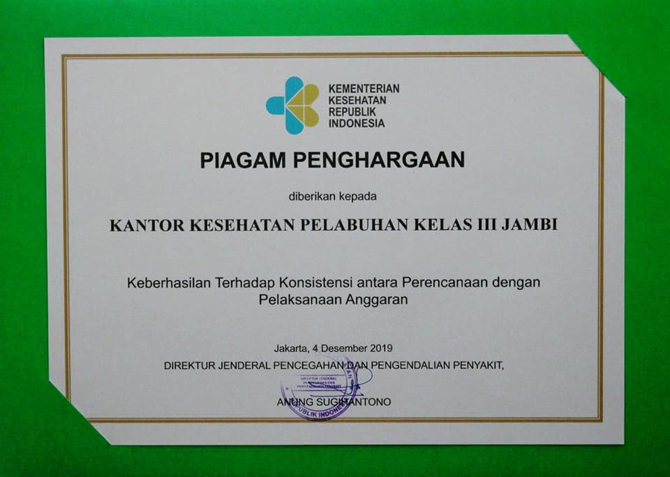 Jakarta - Kementerian Kesehatan RI, melalui Direktur Jendral Pengendalian dan Pencegahan Penyakit Rabu 4 Desember 2019 memberikan Piagam Penghargaan Kepada Kantor Kesehatan Pelabuhan Kelas III Jambi atas Keberhasilan terhadap konsistensi antara perencanaan dan pelaksanaan anggaran ditahun kerja 2019, dalam kegiatan ini penghargaan langsung diberikan oleh Direktur Jendral Pengendalian dan Pencegahan Penyakit bapak Anung Sugihantono.