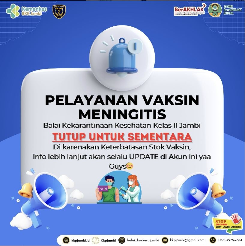 Info penting untuk sobat balaikarkes jambi, saat ini Pelayanan Vaksinasi Meningitis di Balai Kekarantinaan Kesehatan Kelas II Jambi Sementara di TUTUP di karenakan keterbatasan Stok Vaksin.
