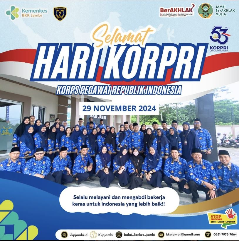 Balai Kekarantinaan Kesehatan Kelas II Jambi Mengucapkan Selamat HUT Korpri ke-53 Tahun 2024. Semoga Korps Pegawai Republik Indonesia senantiasa dapat melayani dan mengabdi kepada Indonesia dengan setulus hati.