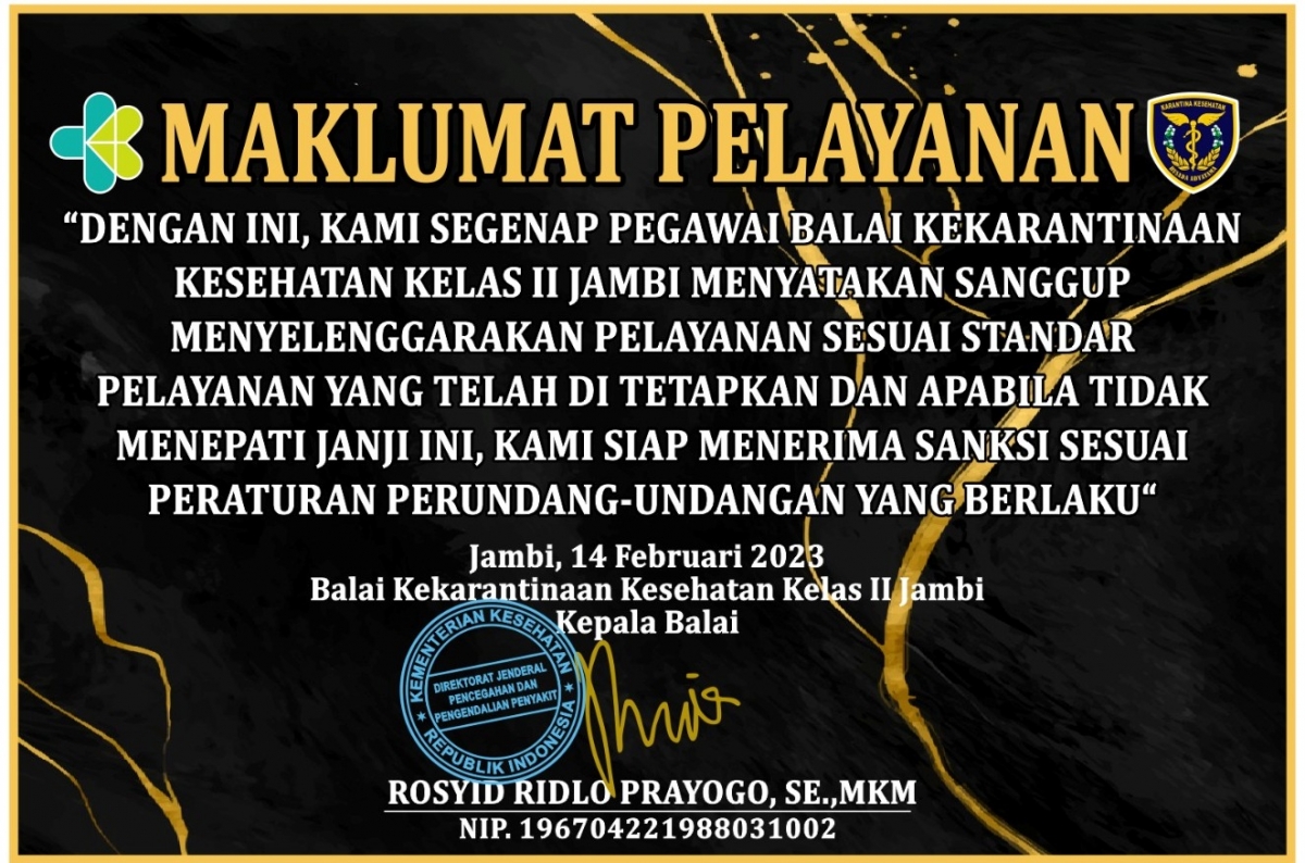 SELAMAT DATANG DI WEBSITE BALAI KEKARANTINAAN KESEHATAN KELAS II JAMBI ~ BKK JAMBI SIAP MENUJU SATKER WBK/WBBM ~ "MULIA" (Maju, Unggul, Lestari, Indah, Agung) - KKP Jambi Call Center +62 851-7978-7864 --