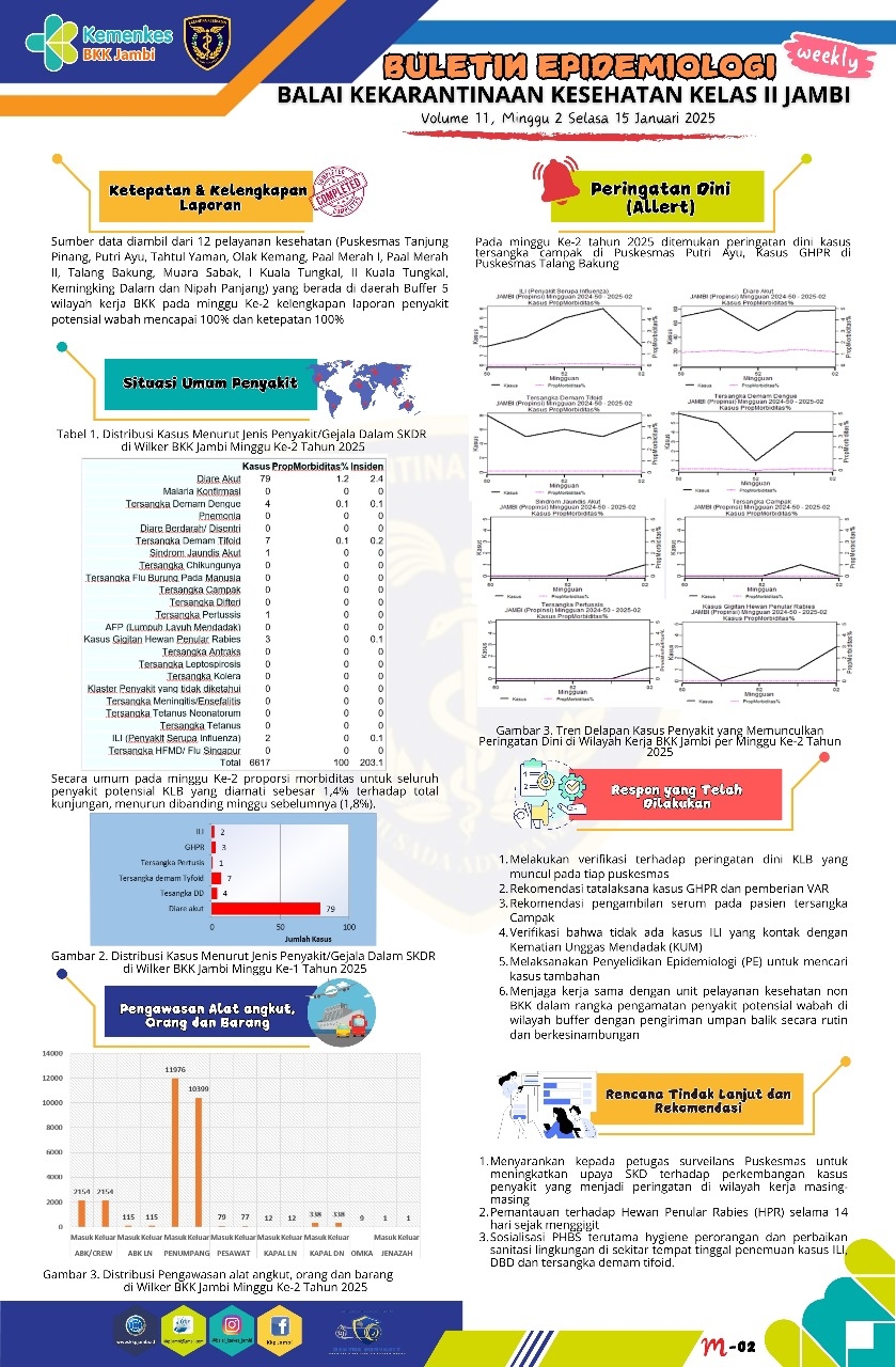 Tugas pokok Balai Kekarantinaan Kesehatan (BKK) Kelas II Jambi adalah mencegah masuk dan keluarnya penyakit, serta mengendalikan risiko kesehatan di wilayah kerja. Salah satu tugas pokok yang dilaksanakan adalah melaksanakan surveilans epidemiologi melalui pengumpulan, pengolahan, analisis dan interpretasi data serta diseminasi informasi. Pelaksanaan diseminasi informasi dilaksanakan salah satunya dengan penyusunan dan penyebarluasan buletin epidemiologi mingguan.