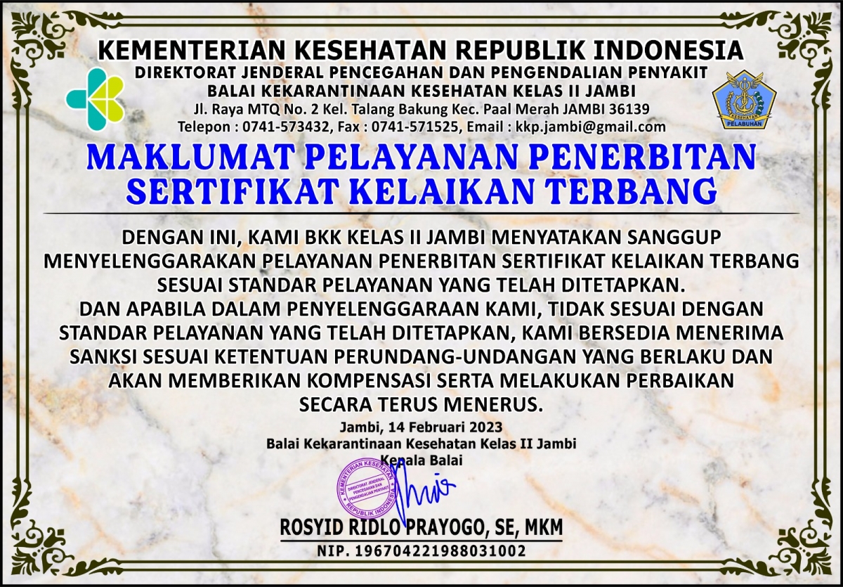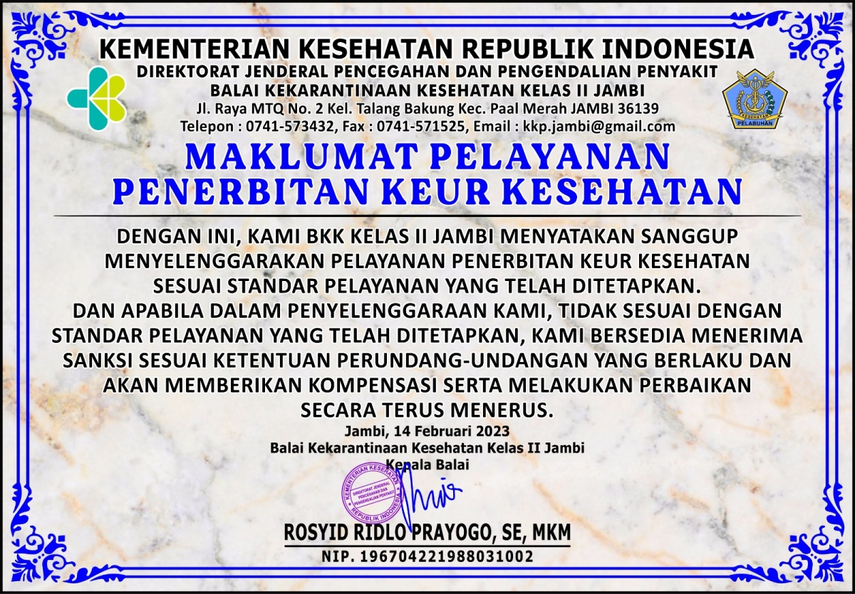 SELAMAT DATANG DI WEBSITE BALAI KEKARANTINAAN KESEHATAN KELAS II JAMBI ~ BKK JAMBI SIAP MENUJU SATKER WBK/WBBM ~ "MULIA" (Maju, Unggul, Lestari, Indah, Agung) - KKP Jambi Call Center +62 851-7978-7864 --
